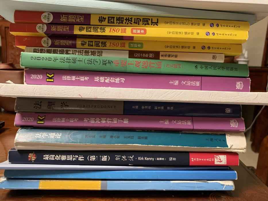 个人用书:《法学通论》《法硕考前冲刺背诵手册》《法硕重要主观题背诵》《法理学》《华政题库》《法硕基础配套练习》《思想道德修养与法律基础》等