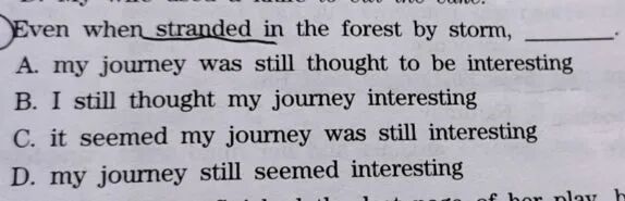 这里,逗号前面是一个独立主格结构,其主语和主句的主语一致,所以独立主格的主语被省略了。补全逗号前的部分应该是Even when sb was stranded in the frost,这里的独立主格结构的意思是”即使被暴风雨困在森林里“,可知主语是人,选项里只有B的主语是人,所以选B