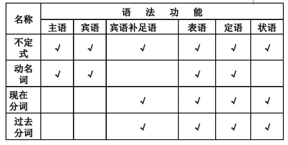 分类(不定式,现在分词、过去分词,动名词);语法功能(做主语、宾语、宾补、表语、定语、状语)