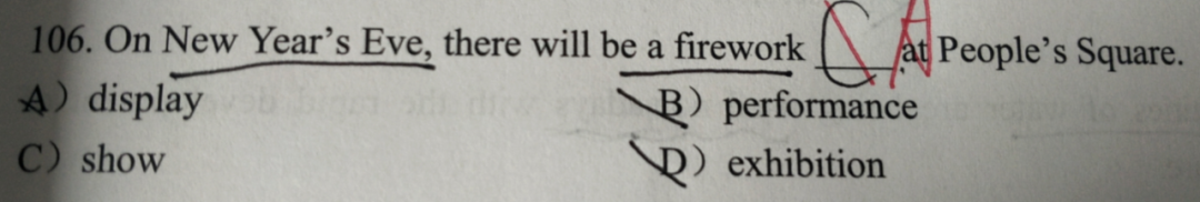 烟火秀是a firework display,一般不说 a firework show,可以当固定搭配记下这个考点。