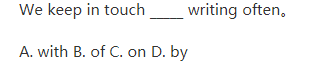 这一题有同学可能会想到固定搭配keep in touch with,所以选了A,但是with后面跟的是某人,表示“与某人保持联系“,这题的意思是“我们通过写信保持联系”,所以应该选by表示方式。